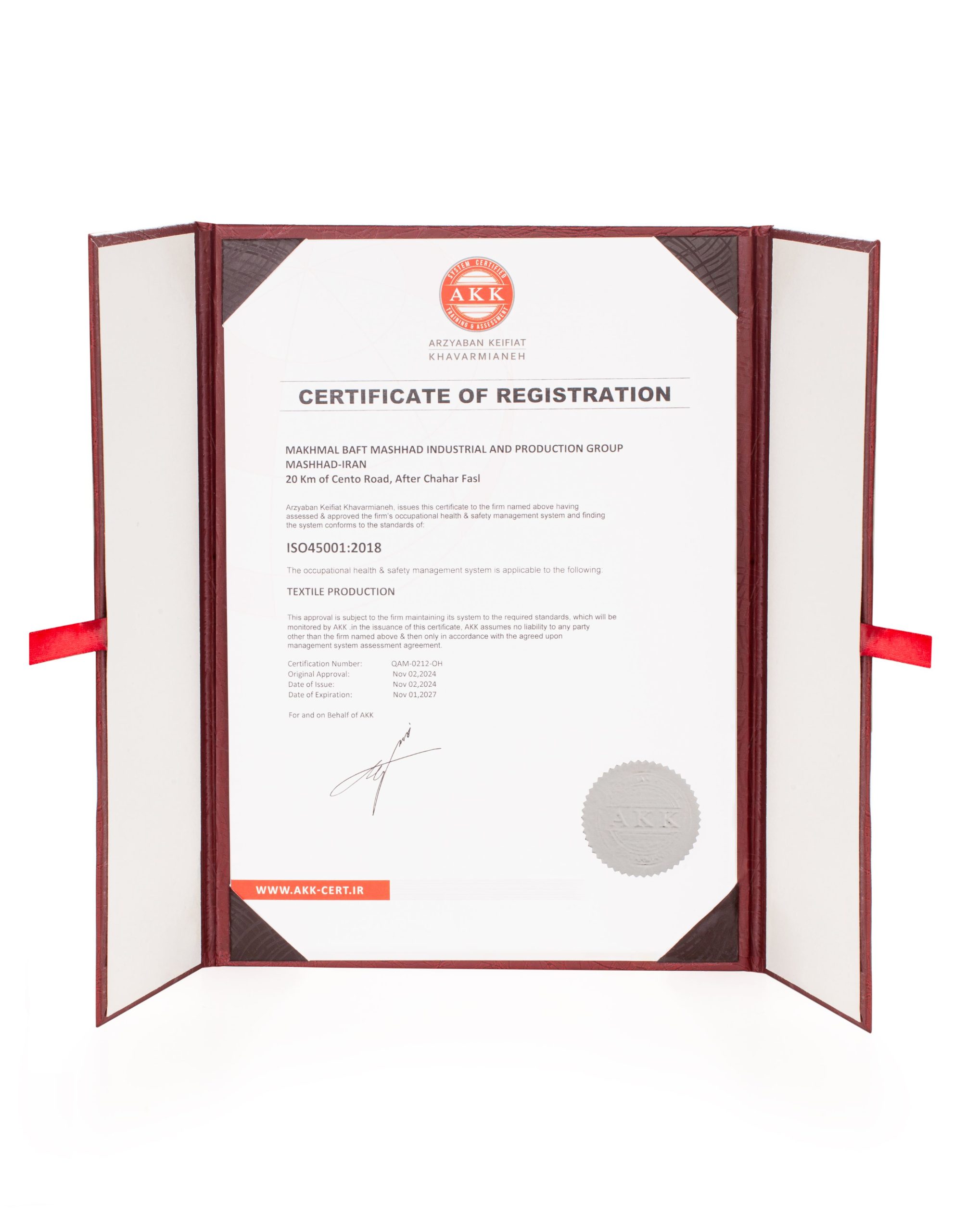 ISO 45001 is the international standard for occupational health and safety management systems. Makhmal Baft Mashhad Industrial Group views this certification as a vital step in protecting its workforce and promoting a culture of safety.